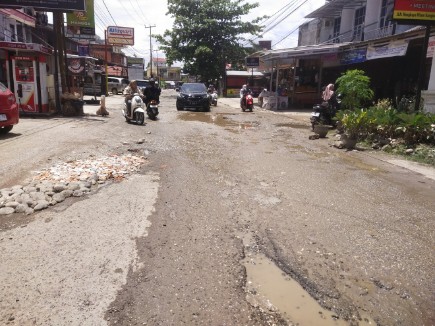 Merangin – Kondisi jalan Rangkayo Hitam yang berada di dalam kota Bangko, Kabupaten Merangin,  Provinsi Jambi tepatnya didepan pertokoan dan hotel sudah lama rusak dengan kondisi berlubang belum ada perbaikan, sehingga dikeluhkan pengendara bermotor yang sedang lewat.