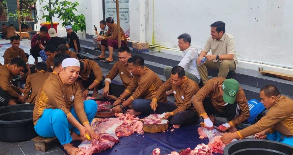 Usai melaksanakan sholat Ied selanjutnya dilakukan pemotongan hewan kurban di halaman belakang kompleks kantor Kejati Jambi, Jumat (6/6/2025).